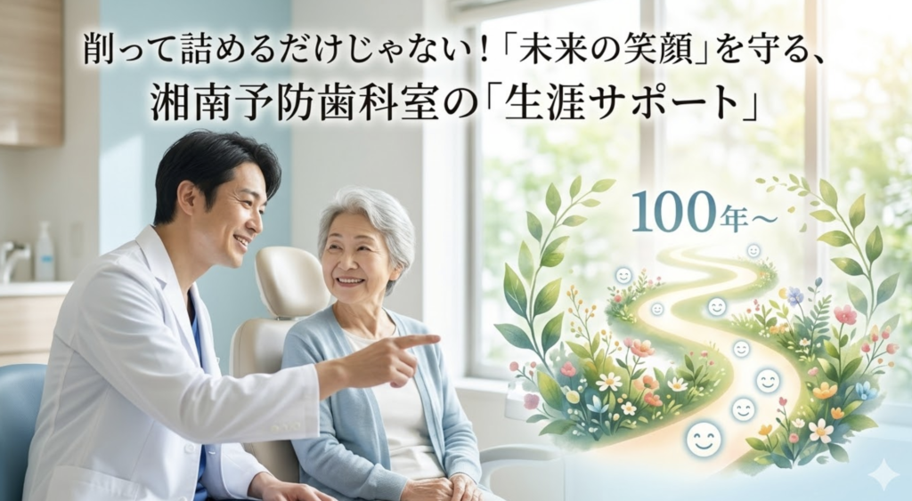 湘南予防・歯科室では、目の前の症状だけを見るのではなく、これから先のお口の健康まで見据えた「未来に対する治療」を大切にしています。この記事では、その考え方と、なぜそれが人生100年時代に必要なのかを、やさしくわかりやすくお伝えします。